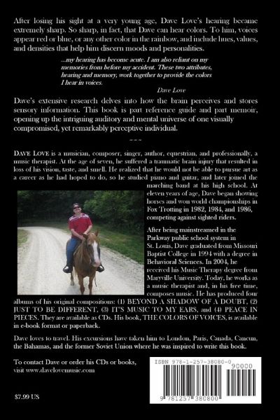In 1979, Dave Love lost his sight. This book presents his methods of using sounds and color memory to recognize people and discern moods and personalities. Citing well-documented sources, he explains how individuals perceive visual and auditory information, presenting a rare glimpse into the mental workings of a visually-challenged person, revealing that everyone owns a voice of its own color.