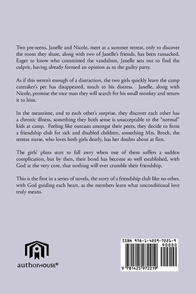 Two pre-teens, Janelle and Nicole, meet at a summer retreat, only to discover the room they share, along with two of Janelle's friends, has been ransacked. Eager to know who committed the vandalism, Janelle sets out to find the culprit, having already formed an opinion as to the guilty party. As if this weren't enough of a distraction, the two girls quickly learn the camp caretaker's pet has disappeared, much to his distress. Janelle, along with Nicole, promise the nice man they will search for his small monkey and return it to him. In the meantime, and to each other's surprise, they discover each other has a chronic illness, something they both sense is unacceptable to the "normal" kids at camp. Feeling like outcasts amongst their peers, they decide to form a friendship club for sick and disabled children, something Mrs. Brock, the retreat nurse, who loves both girls dearly, has her doubts about at first. The girls' plans start to fall awry when one of them suffers a sudden complication, but by then, their bond has become so well established, with God at the very core, that nothing will ever crumble their friendship. This is the first in a series of novels, the story of a friendship club like no other, with God guiding each heart, as the members learn what unconditional love truly means.