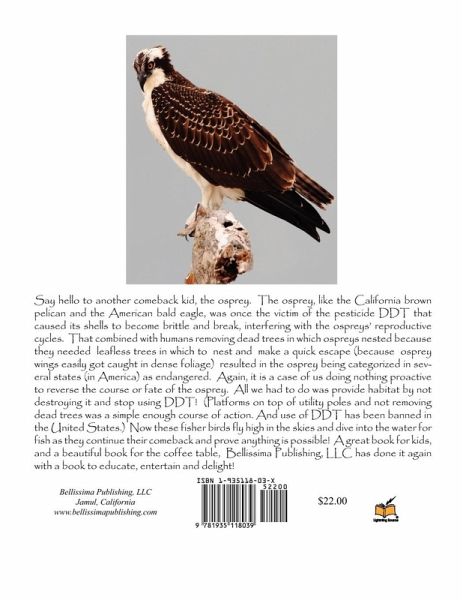 Say hello to another comeback kid, the osprey. The osprey, like the California brown pelican and the American bald eagle, was once the victim of the pesticide DDT that caused its shells to become brittle and break, interfering with the ospreys' reproductive cycles. That combined with humans removing dead trees in which ospreys nested because they needed leafless trees in which to nest and make a quick escape (because osprey wings easily got caught in dense foliage) resulted in the osprey being categorized in several states (in America) as endangered. Again, it is a case of us doing nothing proactive to reverse the course or fate of the osprey. All we had to do was provide habitat by not destroying it and stop using DDT! (Platforms on top of utility poles and not removing dead trees was a simple enough course of action. And use of DDT has been banned in the United States.) Now these fisher birds fly high in the skies and dive into the water for fish as they continue their comeback and prove anything is possible! A great book for kids, and a beautiful book for the coffee table, Bellissima Publishing, LLC has done it again with a book to educate, entertain and delight!