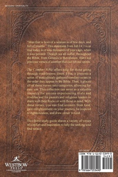 "Man that is born of a woman is of few days, and full of trouble." This statement from Job 14:1 is as true today as it was thousands of years ago, when it was penned. Though we all suffer, throughout the Bible, from Genesis to Revelation, there are precious verses of comfort that can lift our spirits. The Comfort Bible offers help for those going through troublesome times. First, it presents a series of meticulously gathered comfort verses in the order they appear in the Bible. Then, it places all of these verses into categories, allowing for easy use. This collection can serve as a valuable resource for anyone experiencing trials and troubles and for pastors and religious leaders to share with their flocks or with those in need. With these verses, you can find answers from God, gain enlightenment on your journey, be inspired to righteousness, and draw closer to God. This Bible study guide shares a variety of verses of comfort and inspiration to help the seeking soul find solace.