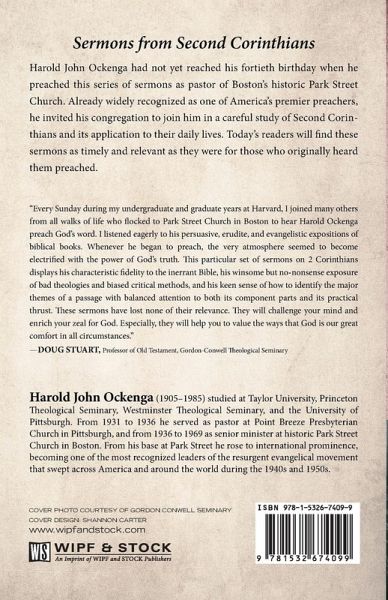 Sermons from Second Corinthians Harold John Ockenga had not yet reached his fortieth birthday when he preached this series of sermons as pastor of Boston's historic Park Street Church. Already widely recognized as one of America's premier preachers, he invited his congregation to join him in a careful study of Second Corinthians and its application to their daily lives. Today's readers will find these sermons as timely and relevant as they were for those who originally heard them preached.