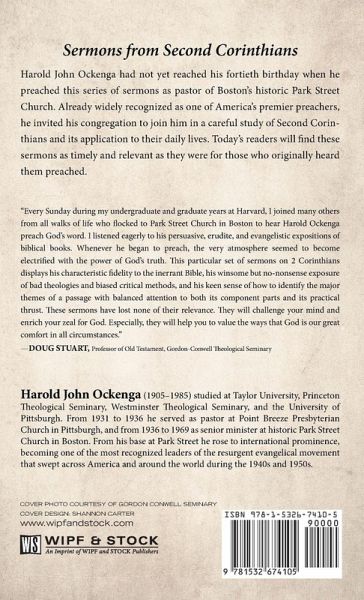 Sermons from Second Corinthians Harold John Ockenga had not yet reached his fortieth birthday when he preached this series of sermons as pastor of Boston's historic Park Street Church. Already widely recognized as one of America's premier preachers, he invited his congregation to join him in a careful study of Second Corinthians and its application to their daily lives. Today's readers will find these sermons as timely and relevant as they were for those who originally heard them preached.