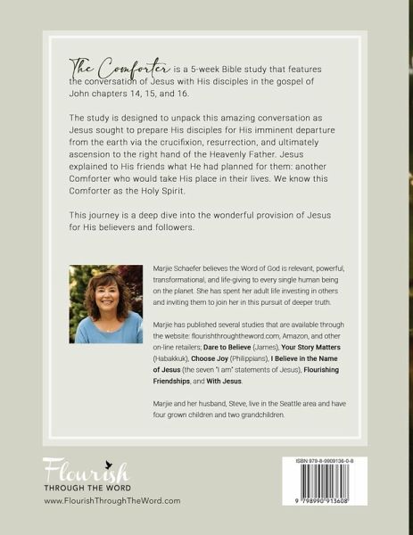 The Comforter is a 5-week Bible study that features the conversation of Jesus with His disciples in the gospel of John chapters 14, 15, and 16. The study is designed to unpack this amazing conversation as Jesus sought to prepare His disciples for His imminent departure from the earth via the crucifixion, resurrection, and ultimately ascension to the right hand of the Heavenly Father. Jesus explained to His friends what He had planned for them: another Comforter who would take His place in their lives. We know this Comforter as the Holy Spirit. This journey is a deep dive into the wonderful provision of Jesus for His believers and followers. Marjie Schaefer believes the Word of God is relevant, powerful, transformational, and life-giving to every single human being on the planet. She has spent her adult life investing in others and inviting them to join her in this pursuit of deeper truth. Marjie has published several studies that are available through the website: flourishthroughtheword.com, Amazon, and other on-line retailers.; Dare to Believe (James), Your Story Matters (Habakkuk), Choose Joy (Philippians), I Believe in the Name of Jesus (the seven "I am" statements of Jesus), Flourishing Friendships, and With Jesus. Marjie and her husband, Steve, live in the Seattle area and have four grown children and two grandchildren.