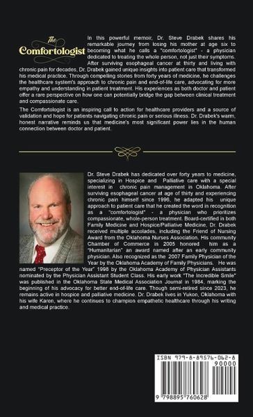 The Comfortologist: A Physician's Empathetic Perspective on Compassion, Caring, and Pain ReliefFrom surviving esophageal cancer at age thirty to pioneering compassionate end-of-life care, Dr. Steve Drabek shares his remarkable journey as both physician and patient in this powerful memoir that challenges modern medicine's approach to chronic pain and terminal illness.Are you:¿ A healthcare professional seeking to provide more empathetic patient care?¿ Someone struggling with chronic pain who feels misunderstood by the medical system?¿ A caregiver or family member navigating end-of-life decisions?Drawing from forty years of medical practice and his own experiences with life-threatening illness, chronic pain, and serving as a hospice physician, Dr. Drabek offers unique insights into:¿ Why treating the whole person matters more than treating symptoms¿ How to navigate the complex landscape of chronic pain management¿ Understanding the true meaning of "quality of life" in terminal illness¿ Finding dignity and comfort in end-of-life careWhat sets this book apart is Dr. Drabek's role as both healer and patient. Board-certified in Family Medicine and Hospice/Palliative Medicine, his perspective bridges the gap between clinical treatment and compassionate care. His innovative approach earned him recognition as a "comfortologist" and the Friend of Nursing Award from the Oklahoma Nurses Association.Through compelling patient stories and personal revelations, The Comfortologist offers hope and practical guidance for anyone touched by chronic illness or end-of-life challenges. This isn't just another medical memoir-it's a call for more humane, patient-centered healthcare.Click "Buy Now" to discover how empathy and understanding can transform medical care and patient outcomes.