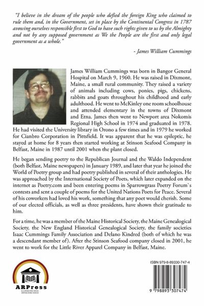 James William Cummings was born in Bangor General Hospital on March 9, 1960. He was raised in Dixmont, Maine, a small rural community. They raised a variety of animals including cows, ponies, pigs, chickens, rabbits and goats throughout his childhood and early adulthood. He went to McKinley one room schoolhouse and attended elementary in the towns of Dixmont and Etna. James then went to Newport area Nokomis Regional High School in 1974 and graduated in 1978. He had visited the University library in Orono a few times and in 1979 he worked for Cianbro Corporation in Pittsfield. It was apparent that he was epileptic, he stayed at home for 8 years then started working at Stinson Seafood Company in Belfast, Maine in 1987 until 2001 when the plant closed.He began sending poetry to the Republican Journal and the Waldo Independent (both Belfast, Maine newspapers) in January 1989, and later that year he joined the World of Poetry group and had poetry published in several of their anthologies. He was approached by the International Society of Poets, which later expanded on the internet as Poetry.com and been entering poems in Sparrowgrass Poetry Forum`s contests and sent a couple of poems for the United Nations Poets for Peace. Several of his coworkers had loved his work, something that any poet would cherish. Some of our elected officials, as well as three presidents, have shown their gratitude to him. For a time, he was a member of the Maine Historical Society, the Maine Genealogical Society, the New England Historical Genealogical Society, the family societies Isaac Cummings Family Association and Delano Kindred (both of which he was a descendant member of). After the Stinson Seafood company closed in 2001, he went to work for the Little River Apparel Company in Belfast, Maine.