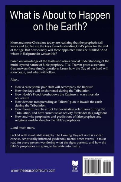 In "2012-2015: The Season of Return?" T.W. Tramm identifies the signs of the Lord's return and a time frame to watch. In his follow-up book, "The Coming Days of Awe," he poses an end-times scenario that answers the questions on every watcher's mind: How will the Day of the Lord begin? And what will follow? Learn how a cataclysmic pole shift will occur at a time few anticipate; how demons masquerading as "aliens" plan to invade the earth; how the length of the days will be shortened during the Tribulation. Also explained: How the fall feasts and Jubilee reveal the chronology of end-times events; why there is so much confusion surrounding the timing of the Rapture; how the Tribulation will be more terrible than imagined, and what every Christian must do before it begins. Meticulously researched and packed with invaluable insights, The Coming Days of Awe is a must read for every person wondering what the signs portend and how the Bible's end-times prophecies are going to be fulfilled.