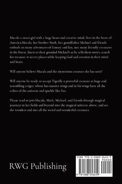 Macala a sweet girl with a huge heart and creative mind, lives in the heart of America.Macala, her brother Mark, her grandfather Michael and friends embark on many adventures of fantasy and fun, met many friendly creatures in the forest, listen to their grandad Michael's as he tells them storys, search for treasure in secret places while keeping God and creation in their mind and heart. Will anyone believe Macala and the mysterious creature she has seen? Will anyone be ready to accept Tigerfly a powerful creature as huge and resembling a tiger, whose has massive wings and in his wings have all the colors of the universe and sparkle like fire. Please read to join Macala, Mark, Michael, and friends through magical journeys in her fields and beyond into the magical universe above, and see the wonders and met all the weird and wonderful creatures.