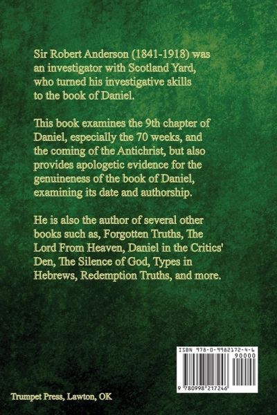 Sir Robert Anderson (1841 - 1918) was an investigator with Scotland Yard, who turned his investigative skills to the book of Daniel. This book examines Daniel, especially the 70 weeks, and the coming of the Antichrist, but also provides apologetic evidence for the genuineness of the book of Daniel, examining its date and authorship. This edition includes all charts, tables, and footnotes originally published In "The Coming Prince" but the charts and tables have been reformatted making them easier to read and understand. He is also the author of several other books such as, Forgotten Truths, The Lord From Heaven, Daniel in the Critics' Den, The Silence of God, Types in Hebrews, Redemption Truths, and more. CHAPTER 1: Introductory CHAPTER 2: Daniel And His Times CHAPTER 3: The King’s Dream And The Prophet’s Visions CHAPTER 4: The Vision By The River Of Ulai CHAPTER 5: The Angel’ s Message CHAPTER 6: The Prophetic Year CHAPTER 7: The Mystic Era Of The Weeks CHAPTER 8: "Messiah The Prince" CHAPTER 9: The Paschal Supper CHAPTER 10: Fulfillment Of The Prophecy CHAPTER 11: Principles Of Interpretation CHAPTER 12: Fullness Of The Gentiles CHAPTER 13: Second Sermon On The Mount CHAPTER 14: The Patmos Visions CHAPTER 15: The Coming Prince