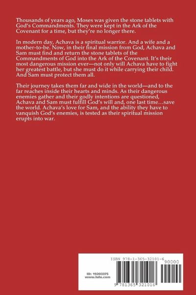 Thousands of years ago, Moses was given the stone tablets with God's Commandments. They were kept in the Ark of the Covenant for a time, but they're no longer there... In modern day, Achava is a spiritual warrior. And a wife and a mother-to-be. Now, in their final mission from God, Achava and Sam must find and return the stone tablets of the Commandments of God into the Ark of the Covenant. It's their most dangerous mission ever-not only will Achava have to fight her greatest battle, but she must do it while carrying their child. And Sam must protect them all... Their journey takes them far and wide in the world-and to the far reaches inside their hearts and minds. As their dangerous enemies gather and their godly intentions are questioned, Achava and Sam must fulfill God's will and, one last time...save the world. Achava's love for Sam, and the ability they have to vanquish God's enemies, is tested as their spiritual mission erupts into war.