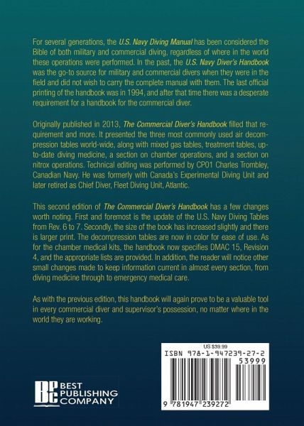 For several generations, the U.S. Navy Diving Manual has been considered the Bible of both military and commercial diving, regardless of where in the world these operations were performed. In the past, the U.S. Navy Diver's Handbook was the go-to source for military and commercial divers when they were in the field and did not wish to carry the complete manual with them. The last official printing of the handbook was in 1994, and after that time there was a desperate requirement for a handbook for the commercial diver. Originally published in 2013, The Commercial Diver's Handbook filled that requirement and more. It presented the three most commonly used air decompression tables world-wide, along with mixed gas tables, treatment tables, up-to-date diving medicine, a section on chamber operations, and a section on nitrox operations. Technical editing was performed by CP01 Charles Trombley, Canadian Navy. He was formerly with Canada's Experimental Diving Unit and later retired as Chief Diver, Fleet Diving Unit, Atlantic. This second edition of The Commercial Diver's Handbook has a few changes worth noting. First and foremost is the update of the U.S. Navy Diving Tables from Rev. 6 to 7. Secondly, the size of the book has increased slightly and there is larger print. The decompression tables are now in color for ease of use. As for the chamber medical kits, the handbook now specifies DMAC 15, Revision 4, and the appropriate lists are provided. In addition, the reader will notice other small changes made to keep information current in almost every section, from diving medicine through to emergency medical care. As with the previous edition, this handbook will again prove to be a valuable tool in every commercial diver and supervisor's possession, no matter where in the world they are working.