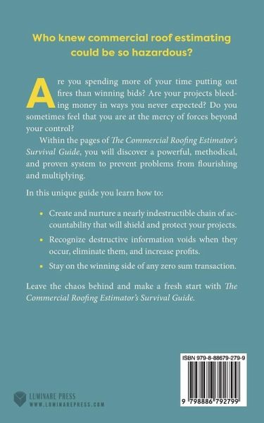 Who knew commercial roof estimating could be so hazardous? Are you spending more of your time putting out fires than winning bids? Are your projects bleeding money in ways you never expected? Do you sometimes feel that you are at the mercy of forces beyond your control? Within the pages of The Commercial Roofing Estimator's Survival Guide, you will discover a powerful, methodical, and proven system to prevent problems from flourishing and multiplying. In this unique guide you learn how to:Create and nurture a nearly indestructible chain of accountability that will shield and protect your projects. Recognize destructive information voids when they occur, eliminate them, and increase profits. Stay on the winning side of any zero sum transaction. Leave the chaos behind and make a fresh start with The Commercial Roofing Estimator's Survival Guide.