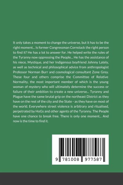 It only takes a moment to change the universe, but it has to be the right moment... Is former Congressman Cornstack the right person to find it? He has a lot to answer for. He helped write the rules of the Tyranny now oppressing the People... He has the assistance of his niece, Mystique, and her Indigenous boyfriend Johnny Lately, as well as technical and philosophical advice from anthropologist Professor Norman Burr and cosmological consultant Zone Grey. These four and others comprise the Committee of Relative Normality, the most important member of which is the young woman of mystery who will ultimately determine the success or failure of their ambition to create a new universe... Tyranny and Plague have the same brutal grip on the northeast District as they have the rest of the city and the State - as they have on most of the world. Everywhere street violence is arbitrary and ritualised, perpetrated by HoGs and other agents of the Tyranny. The People have one chance to break free. There is only one moment... And now is the time to find it.