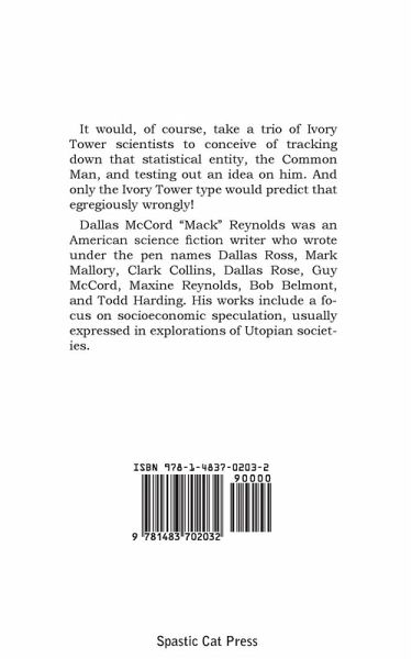 It would, of course, take a trio of Ivory Tower scientists to conceive of tracking down that statistical entity, the Common Man, and testing out an idea on him. And only the Ivory Tower type would predict that egregiously wrongly! Dallas McCord "Mack" Reynolds was an American science fiction writer who wrote under the pen names Dallas Ross, Mark Mallory, Clark Collins, Dallas Rose, Guy McCord, Maxine Reynolds, Bob Belmont, and Todd Harding. His works include a focus on socioeconomic speculation, usually expressed in explorations of Utopian societies.
