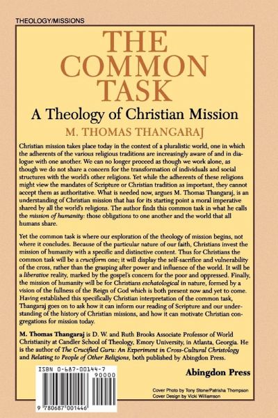 Christian mission takes place today in the context of a pluralistic world, one in which the adherents of the various religious traditions are increasingly aware of and in dialogue with one another. What is needed now, argues Thangaraj, is an understanding of Christian mission that has for its starting point a moral imperative shared by all the world's religions. The author finds this common task in what he calls the mission of humanity: those obligations to one another and the world which all humans share. For Christians the common task will be a cruciform one; it will display the self-sacrifice and vulnerability of the cross, rather than the grasping after power and influence of the world. It will be a liberative reality, marked by the gospel's concern for the poor and oppressed. Finally, the mission of humanity will be for Christians eschatological in nature, formed by a vision of the fullness of the reign of God which is both present now and yet to come. Having established this specifically Christian interpretation of the common task, Thangaraj goes on to ask how it can inform our reading of Scripture and our understanding of Christian missions, and how it can motivate Christian congregations for mission today.