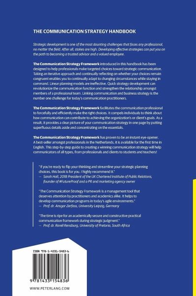 The Communication Strategy Framework introduced in this handbook has been designed to help professionals make targeted choices toward strategic communication. Taking an iterative approach and continually reflecting on whether your choices remain congruent enables you to continually adapt to changing circumstances while staying in command. Linear planning models are ineffective. Quick strategy development can revolutionize the communication function and strengthen the relationship amongst members of a professional team. Linking communication and business strategy is the number one challenge for today's communication practitioners.