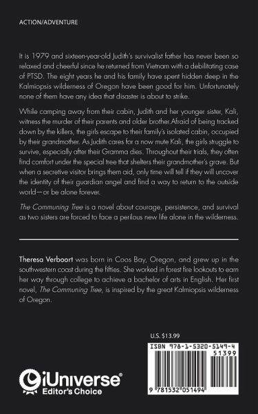 It is 1979 and sixteen-year-old Judith's survivalist father has never been so relaxed and cheerful since he returned from Vietnam with a debilitating case of PTSD. The eight years he and his family have spent hidden deep in the Kalmiopsis wilderness of Oregon have been good for him. Unfortunately none of them have any idea that disaster is about to strike. While camping away from their cabin, Judith and her younger sister, Kali, witness the murder of their parents and older brother.Afraid of being tracked down by the killers, the girls escape to their family's isolated cabin, occupied by their grandmother. As Judith cares for a now mute Kali, the girls struggle to survive, especially after their Gramma dies. Throughout their trials, they often find comfort under the special tree that shelters their grandmother's grave. But when a secretive visitor brings them aid, only time will tell if they will uncover the identity of their guardian angel and find a way to return to the outside world-or be alone forever. The Communing Tree is a novel about courage, persistence, and survival as two sisters are forced to face a perilous new life alone in the wilderness.