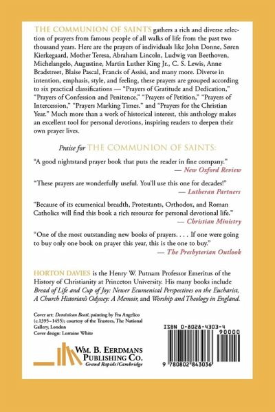 This is a print on demand book and is therefore non- returnable. The communion of saints gathers a rich and diverse selection of prayers from famous people of all walks of life from the past two thousand years. Here are the prayers of such individuals as John Donne, Soren Kierkegaard, Mother Teresa, Abraham Lincoln, Ludwig van Beethoven, Michelangelo, Augustine, Martin Luther King Jr., C. S. Lewis, Anne Bradstreet, Blaise Pascal, Francis of Assisi, and many more. Diverse in intention, emphasis, style, and feeling, these prayers are grouped according to six practical classifications: "Prayers of Gratitude and Dedication," "Prayers of Confession and Penitence," "Prayers of Petition," "Prayers of Intercession," "Prayers Marking Times," and "Prayers for the Christian Year." Much more than a work of historical interest, this anthology makes an excellent tool for personal devotions, inspiring readers to deepen their own prayer lives.