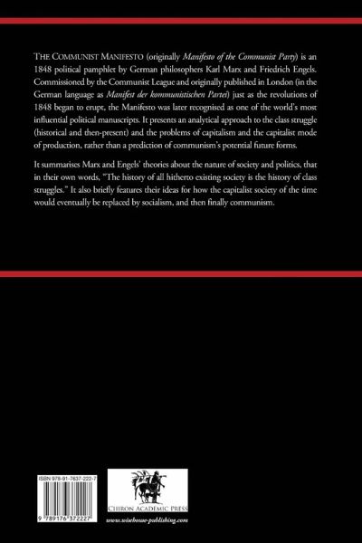 THE COMMUNIST MANIFESTO (originally Manifesto of the Communist Party) is an 1848 political pamphlet by German philosophers Karl Marx and Friedrich Engels. Commissioned by the Communist League and originally published in London (in the German language as Manifest der kommunistischen Partei) just as the revolutions of 1848 began to erupt, the Manifesto was later recognised as one of the world's most influential political manuscripts. It presents an analytical approach to the class struggle (historical and then-present) and the problems of capitalism and the capitalist mode of production, rather than a prediction of communism's potential future forms. It summarises Marx and Engels' theories about the nature of society and politics, that in their own words, "The history of all hitherto existing society is the history of class struggles." It also briefly features their ideas for how the capitalist society of the time would eventually be replaced by socialism, and then finally communism. (more on www.wisehouse-publishing.com)