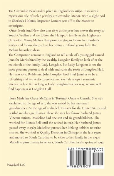 The Cavendish Pearls takes place in England circa1890. It weaves a mysterious tale of stolen jewelry at Cavendish Manor. With a slight nod to Sherlock Holmes, Inspector Lemont sets off to the Manor to investigate. Once Fresh And New also uses 1890 as the year but moves the story to South Carolina and we follow the Hampton family at the Highacers plantation. Young Melissa Hampton is trying to follow her mother's wishes and follow the path to becoming a refined young lady. But Melissa has other ideas. The Companion returns to England to tell a tale of a young girl named Jennifer Marks hired by the wealthy Longdon family to look after the matriarch of the family, Lady Longdon. But Lady Longdon is not the most pleasant person to deal with and rules the roost of Longdon Hall. Her two sons, Robin and John Longdon both find Jennifer to be a refreshing and attractive presence and each develops a romantic interest in her. But as long as Lady Longdon has her way, no one will find happiness at Longdon Hall.