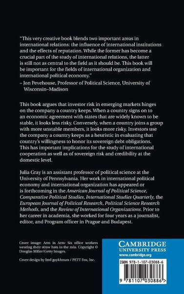 This book argues that investor risk in emerging markets hinges on the company a country keeps. When a country signs on to an economic agreement with states that are widely known to be stable, it looks less risky. Conversely, when a country joins a group with more unstable members, it looks more risky. Investors use the company a country keeps as a heuristic in evaluating that country's willingness to honor its sovereign debt obligations. This has important implications for the study of international cooperation as well as of sovereign risk and credibility at the domestic level.