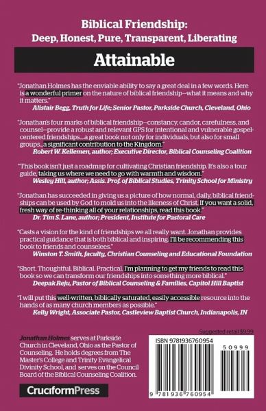 Friendship: it's one of the simplest of human relationships in comparison to marriage or family relationships, yet it's one of the least understood and practiced. For all of our progress in making connections through Facebook, Twitter, and other social media, people are consistently experiencing loneliness and growing disenchanted with the whole notion of friendship. Could it be that our understanding of friendship has been more informed by pop culture and social media, and less informed by the vision of friendship offered in Scripture? Is it possible that friendship exists for a greater purpose than merely our enjoyment and comfort? Does real friendship involve more than just hanging out on a weekend, participating in a book club, or hitting the golf course together? These questions and more are answered in this book. Broader and deeper than simple fellowship, biblical friendship is first and foremost about a relationship with Jesus Christ. As you are brought into friendship and relationship with the Father, Jesus Christ calls you a friend! It is out of this friendship that our human friendships find their beginning and their purpose. Aelred, a Cistercian monk who wrote a profound treatise on friendship, said, "And so in friendship are joined honor and charm, truth and joy, sweetness and good-will, affection and action. And all these take their beginning from Christ, advance through Christ, and are perfected in Christ." This is the core of biblical friendship, and what sets it apart from what the world is offering: it all flows from Jesus Christ. Friendship finds its origin, purpose, and power in Jesus. Our human friendships then must be shaped by this life-changing truth. Biblical friendship is deep, honest, pure, transparent, and liberating. It is also attainable. Dig into this book, and learn how your friendships can embody this amazing and wonderful reality.