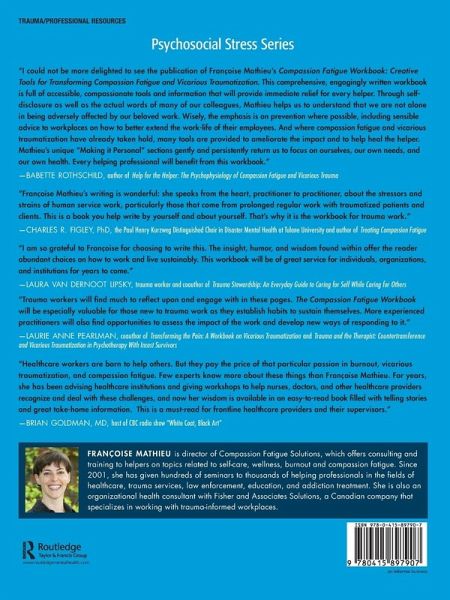 "Françoise Mathieu's writing is wonderful: she speaks from the heart, practitioner to practitioner, about the stressors and strains of human service work, particularly those that come from prolonged regular work with traumatized patients and clients. This is a book you help write by yourself and about yourself. That's why it is the workbook for trauma work." - Charles R. Figley, Tulane University, Louisiana, USA, and author of Treating Compassion Fatigue
