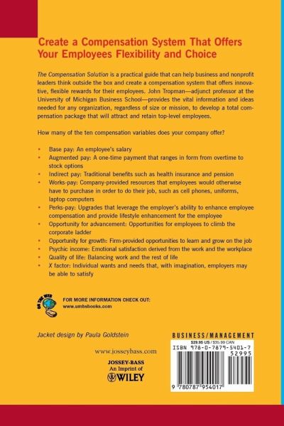 Create a compensation system that offers your employees flexibility and choice The Compensation Solution is a practical guide that can help business and nonprofit leaders think outside the box and create a compensation system that offers innovative, flexible rewards for their employees. John Tropman? adjunct professor at the University of Michigan Business School?provides the vital information and ideas needed for any organization, regardless of size or mission, to develop a total compensation package that will attract and retain top-level employees. How many of the ten compensation variables does your company offer? Base pay: An employee's salary Augmented pay: A one-time payment that ranges in form from overtime to stock options Indirect pay: Traditional benefits such as health insurance and pension Works-pay: Company-provided resources that employees would otherwise have to purchase in order to do their job, such as cell phones, uniforms, laptop computers Perks-pay: Upgrades that leverage the employer's ability to enhance employee compensation and provide lifestyle enhancement for the employee Opportunity for advancement: Opportunities for employees to climb the corporate ladder Opportunity for growth: Firm-provided opportunities to learn and grow on the job Psychic income: Emotional satisfaction derived from the work and the workplace Quality of life: Balancing work and the rest of life X factor: Individual wants and needs that, with imagination, employers may be able to satisfy