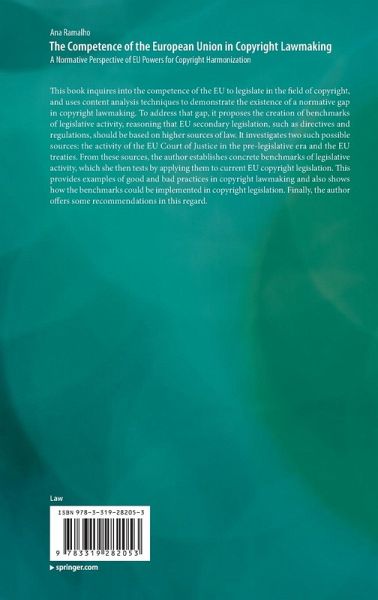 This book inquires into the competence ofthe EU to legislate in the field of copyright, and uses content analysistechniques to demonstrate the existence of a normative gap in copyrightlawmaking. To address that gap, it proposes the creation of benchmarks oflegislative activity, reasoning that EU secondary legislation, such as directivesand regulations, should be based on higher sources of law. It investigates twosuch possible sources: the activity of the EU Court of Justice in thepre-legislative era and the EU treaties. From these sources, the authorestablishes concrete benchmarks of legislative activity, which she then testsby applying them to current EU copyright legislation. This provides examples ofgood and bad practices in copyright lawmaking and also shows how the benchmarkscould be implemented in copyright legislation. Finally, the author offers somerecommendations in this regard.