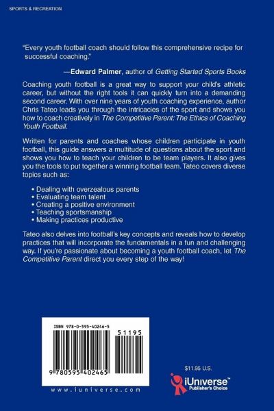 "Every youth football coach should follow this comprehensive recipe for successful coaching." -Edward Palmer, author of Getting Started Sports Books Coaching youth football is a great way to support your child's athletic career, but without the right tools it can quickly turn into a demanding second career. With over nine years of youth coaching experience, author Chris Tateo leads you through the intricacies of the sport and shows you how to coach creatively in The Competitive Parent: The Ethics of Coaching Youth Football. Written for parents and coaches whose children participate in youth football, this guide answers a multitude of questions about the sport and shows you how to teach your children to be team players. It also gives you the tools to put together a winning football team. Tateo covers diverse topics such as: Dealing with overzealous parents Evaluating team talent Creating a positive environment Teaching sportsmanship Making practices productive Tateo also delves into football's key concepts and reveals how to develop practices that will incorporate the fundamentals in a fun and challenging way. If you're passionate about becoming a youth football coach, let The Competitive Parent direct you every step of the way!