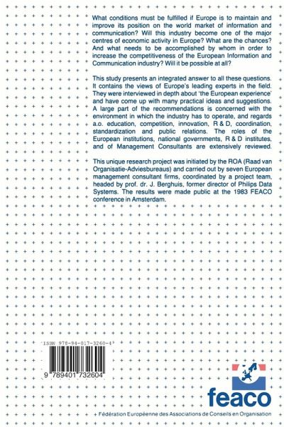 In front of us lies a rather unique study. Unique in respect of both its initiative and its set up. This study is the result of a private initiative of an international organization of management consultancy firms. It is the first time that such a broad international study was undertaken jointly by individual consulting firms in many different countries. Moreover the method used can be characterized as 'from the bottom up'. Representatives of almost 100 organizations in seven European countries were interviewed by seven individual management consultancy firms on the basis of their own reputation and contacts. Not only the well-known multinationals in the information and communication industry participated, but also medium-sized and small companies as well as government agencies. The study focuses on one sector of industry that is considered to be of prime importance for employment in Europe, viz. the information and communication industry. It is generally assumed that important instruments for the stimulation and strengthening of Europe's position in this field are: reduction of competition within Europe better coordination of R&D efforts improved harmonization of rules, standards and regulations better coordination and education programmes increased stimulation and guidance by governments. This study puts these assumptions to the test. It assesses the state of the art regarding these instruments and identifies the actions needed to improve the present situation.