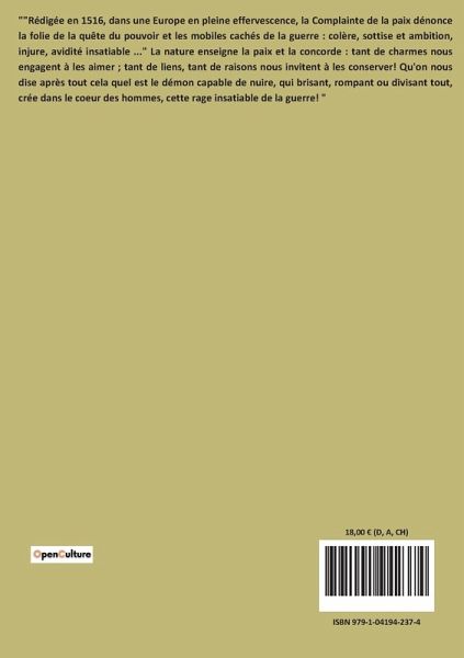 The Reformation scholar and master of Latin prose Desiderius Erasmus has the personification of peace come to earth to deliver her verdict on the human race. She chastises kings and princes, church leaders, noblemen and ordinary soldiers alike for betraying their Christian values by waging unjust and unnecessary wars. ¿This translation of the Querela Pacis of Erasmus is reprinted from a rare old English version. It is probably the 1802 reprint of the translation made by T. Paynell but published anonymously.