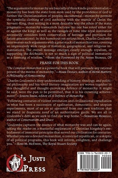 "The arguments for monarchy are basically of three kinds: providentialist-monarchy has been the state form most used by the providence of God to further the Christianization of peoples; sacramental-monarchy permits the symbolic clothing of civil authority with the mantle of Christ the Servant-King, thus setting in a most desirable way the ethos of the state; pragmatic-monarchy transcends factions (no one has voted either for or against the king) as well as the ravages of time (the royal institution necessarily considers both conservation of heritage and provision for future generations). In this humorous yet serious book, Coulombe interweaves such arguments with a great stock of monarchist lore.... The overall message emerges clearly enough: royalism, or supporting the Reichsidee, is not so much a sign of political immaturity as a dawning of wisdom."-from the Foreword by Fr. Aidan Nichols, OP Praise for this book "Enhanced by Coulombe's literary, philosophical, and theological scholarship, The Compleat Monarchist is a powerful book that will persuade any rational person of the merits of monarchy. Its author has earned his reputation as a voice of sanity amid the madding crowd."-Mark Dooley, author of Moral Matters: A Philosophy of Homecoming "Charles Coulombe is one of the most erudite and eloquent of Catholic writers. His deep understanding of history, theology, and political philosophy and his vivid literary imagination are woven together in this thoughtful and thought-provoking defence of monarchy. It might be said, were the pun to be permitted, that it is his crowning achievement!"-Joseph Shaw, editor of A Defence of Monarchy "Why would monarchy-a principle that emerges directly out of nature and which has been consecrated by supernatural religion for millennia-need an American historian to explain it to us? But following centuries of violent revolution and civilisational repudiation in what has been a succession of egalitarian, democratic, and utopian experiments, most of us are so uprooted from our own tradition that we stand in desperate need of an authoritative guide. We are all in Coulombe's debt as we seek to find our way home."-Sebastian Morello, author of Conservatism and Grace "In a world that appears to be increasingly suffering from an acute case of cultural drought and crisis of identity, time and time again we see that the further the West strays from its Christian foundations, including sacral monarchy, the more severe this cultural drought and amnesia becomes. In The Compleat Monarchist, Coulombe captures the essence of what monarchy was and can be again, taking the reader on a masterful exploration of Christian kingship's embodiment of immortal principles that served our civilization for centuries. Whether you are a devoted monarchist, a convicted republican, or a skeptic of all political programs, this book will inform, enlighten, and challenge you."-Ross M. McEwen, The Royal Stuart Society