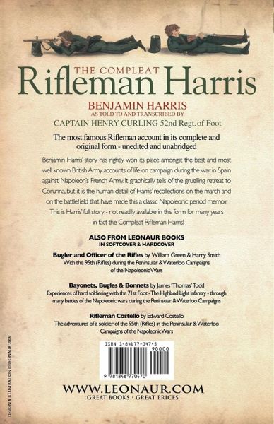 The most famous Rifleman account in its complete and original form - unedited and unabridged. Benjamin Harris' story has rightly won its place amongst the best and most well known British Army accounts of life on campaign during the war in Spain against Napoleon's French Army. It graphically tells of the gruelling retreat to Corunna, but it is the human detail of Harris' recollections on the march and on the battlefield that have made this a classic Napoleonic period memoir. This is Harris' full story - not readily available in this form for many years - in fact the Compleat Rifleman Harris!