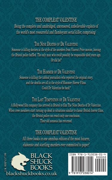 The Compleat Valentine Being the complete and unabridged, uncensored, unbelievable exploits of the world's most resourceful and flamboyant serial killer, comprising: The Nine Deaths of Dr Valentine Someone is killing doctors in the style of the murders from Vincent Price movies, leaving the Bristol police baffled. The only man who could possibly be responsible died years ago. Or did he? The Hammer of Dr Valentine Someone is killing the tabloid journalists who reported the original story, and the deaths are all in the style of Hammer Horror Films. Could Dr Valentine be back? The Last Temptation of Dr Valentine A Hollywood film company has arrived in Bristol to film The Nine Deaths of Dr Valentine. When crew members start turning up dead in situations similar to classic British horror films, the Bristol police can reach only one conclusion. Their old nemesis has returned. The Compleat Valentine All three books in one omnibus edition of the most bizarre, elaborate and startling murders ever committed to paper!
