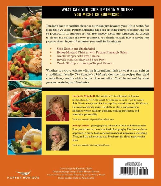 You don't have to sacrifice flavor or nutrition just because your life is hectic. What can you cook up in 15 minutes? You might be surprised! For more than 20 years, Paulette Mitchell has been creating gourmet dishes that can be prepared in 15 minutes or less. Her speedy meals are sophisticated enough to please the palates of savvy gourmets, yet simple enough that a novice can prepare them. In The Complete 15-Minute Gourmet, Paulette shares recipes you could be feasting on in just 15 minutes such as: * Soba Noodle and Steak Salad * Honey-Mustard Chicken with Papaya-Pineapple Salsa * Greek Snapper with Feta Cheese * Ravioli with Hazelnut and Sage Pesto * Creole Shrimp with Asiago-Topped Polenta Whether you crave cuisine with an international flair or want a new spin on a traditional favorite, The Complete 15-Minute Gourmet has recipes that yield extraordinary results with minimal time and effort. You'll be amazed by what you can create in just 15 minutes or less.