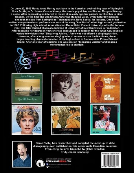 On June 20, 1945, Morna Anne Murray was born in the Canadian coal-mining town of Springhill, Nova Scotia, to Dr. James Carson Murray, the town's physician, and Marion Margaret Murray, a nurse. After expressing an interest in music at an early age, her parents enrolled her in piano lessons. By the time she was fifteen, Anne was studying voice. Every Saturday morning, she took the bus from Springfield to Tatamagouche, Nova Scotia, for lessons. One of her earliest non-professional performances was of the song "Ave Maria" at her high school graduation in 1962. Following high school, Anne attended Mount Saint Vincent University in Halifax for one year. She later studied physical edication at University of New Brunswick in Fredericton. After receiving her degree in 1966 she was encouraged to audition for the 1960s CBC musical variety television show "Singalong Jubilee." Anne was not offered a singing position. However, after a long summer singing in local venues across the Maritimes, Anne began teaching physical education at the high school in Summerside, Prince Edward Island. After one year of teaching, she was cast on "singalong Jubilee" and began a monumental rise to stardom. Daniel Selby has researched and compiled the most up to date discography ever published on this remarkable Canadian musician. From early musical triumphs to global stardom! Truly career spanning!