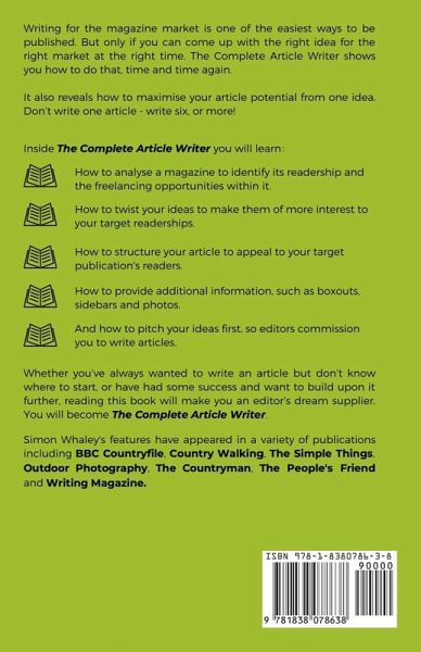 "The Complete Article Writer: How To Write Magazine Articles" will tell you everything you need to know to become a published article writer.Writing for the magazine market is one of the easiest ways to become a published writer. But only if you can come up with the right idea for the right market at the right time. The Complete Article Writer shows you how to do that, time and time again. It also reveals how to maximise your article potential from one idea. Don't write one article - write six or more! It explores how to analyse a publication to identify its readership and the freelancing opportunities within it. Then it guides you into twisting your idea so it appeals to the core readership and the most important reader of all - the editor.With detailed advice about beginnings, middles and endings (the various middle structures can help you exploit your ideas even further), along with other pieces of page furniture, including boxouts, sidebars and photos, The Complete Article Writer will show you how to offer an editor the complete package. And to ensure you approach editors professionally, it gives advice on how to pitch (selling an idea to an editor before you write the piece), and how to negotiate the minefield of publishing rights. Whether you've always wanted to write an article but don't know where to start, or have had some success and want to build upon it further, reading this book will make you an editor's dream supplier. You will become The Complete Article Writer. Simon Whaley's articles have appeared in a variety of publications, including: BBC Countryfile, Country Walking, Lakeland Walker, The Simple Things, Cumbria, Discover Britain, British Heritage, Writing Magazine The People's Friend, Outdoor Photography, The Observer and the Daily Express.