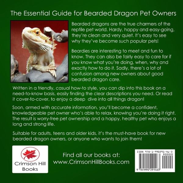 The Essential Guide for Bearded Dragon Pet Owners Bearded dragons are the true charmers of the reptile pet world. Hardy, happy and easy-going, clean and very quiet, it's easy to see why they've become such popular pets! Beardies are interesting to meet and fun to know. They can also be fairly easy to care for if you know what you're doing, when, why and exactly how to do it. Sadly, there's a lot of confusion among new owners about good bearded dragon care: Should their tank be a bit warmer? A bit cooler? Should their lights be on? Off? Does it matter? And what is your pet trying to tell you, when they unfurl their impressive beard, or turn their nose up at dinner, or suddenly start twitching? Is what they're doing normal? Or is it time to call the vet? All this and much more is covered in this complete guide for new to intermediate beardie dragon owners to help them grow in pet knowledge, skills and confidence. You'll find out:How and where to buy the best, healthiest dragon. How to set up their new home properly. What to feed them and what they must never eat. All the behaviours you're likely to see. How to understand what your pet is trying to tell you. What to expect at each stage of your bearded dragon's life. What's safe for your pet? What isn't? How do you keep them healthy? How long will they live? Is it better to have two, so they keep each other company? What are morphs? Hets? Dunners? How to connect with the community of bearded dragon lovers. And much more. Many thousands of bearded dragons will be adopted as pets this year. Sadly, too many will die within months, simply because their owners didn't understand their pets' simple needs. This suffering is almost entirely preventable. All it takes is the right knowledge along with a smart pet care routine. It's all thoroughly explained in this book. You'll learn everything you must do, starting even before you bring your new pet home. The result is worry-free pet ownership and a happy, healthy pet who enjoys a long and strong life. Written in a friendly, casual style, you can dip into this book on a need-to-know basis. You'll find exactly the information you need when you need it with clear descriptions. Or read it cover-to-cover, if you want a deep dive into all things dragon! Suitable for adults, teens and older children, it's the must-have book for expectant, new or recent bearded dragon owners, or anyone who wants to join them!