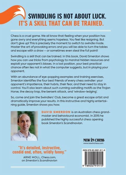 Chess is a cruel game. We all know that feeling when your position has gone awry and everything seems hopeless. You feel like resigning. But don't give up! This is precisely the moment to switch to swindle mode. Master the art of provoking errors and you will be able to turn the tables and escape with a draw - or sometimes even steal the full point!Swindling is a skill that can be trained. In this book, David Smerdon shows how you can use tricks from psychology to marshal hidden resources and exploit your opponent's biases. In a lost position, your best practical chance often lies not in what the computer recommends, but in playing your opponent.With an abundance of eye-popping examples and training exercises, Smerdon identifies the four best friends of every chess swindler: your opponent's impatience, their hubris, their fear, and their need to stay in control. You'll also learn about such cunning swindling motifs as the Trojan Horse, the decoy trap, the berserk attack, and 'window-ledging'. So, come and join the Swindlers' Club, become a great escape artist and dramatically improve your results. In this instructive and wildly entertaining guide, Smerdon shows you how.