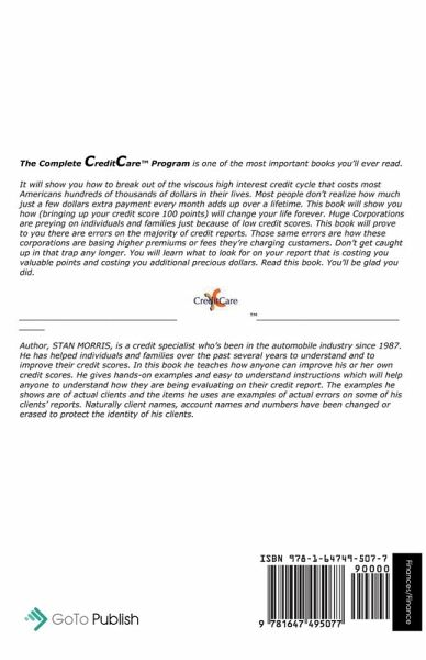 The Complete Credit Care (TM) Program is one of the most important books you'll ever read. It will show you how to break out the viscous high interest credit cycle that costs most Americans hundreds of thousands of dollars in their lives. Most people don't realize how much just a few dollars extra payment every month adds up over a lifetime. This book will show you how (bringing up your credit score 100 points) will change your life forever. Huge Corporations are preying on individuals and families just because of low credit scores. This book will prove to you there are errors on the majority of credit reports. those same errors are how these corporations are basing higher premiums or fees they're charging customers. Don't get caught up in that trap any longer. You will learn what to look for on your report that is costing you valuable points and costing you additional precious dollars. Read this book. You'll be glad you did. Author, STAN MORRIS, is a credit specialist who's been in the automobile industry since 1987. He has helped individuals and families over the past several years to understand and to improve their credit scores. He gives hands-on examples and easy to understand instructions which will help anyone to understand how they are being evaluating on their credit report. The examples he shows are of actual clients and the items he uses are examples of actual errors on some of his clients' reports. Naturally client names, account names and numbers have been changed or erased to protect the identity of his clients.