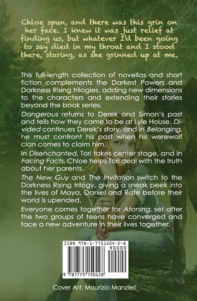 This extended-length anthology of novellas and short fiction complements the Darkest Powers and Darkness Rising trilogies, adding new dimensions to the characters and extending their stories beyond the series. Dangerous returns to Derek and Simon’s past and tells how they came to be at Lyle House. Divided continues Derek’s story, filling in his adventures with Simon while separated from Chloe. In Disenchanted, Tori takes center stage as she travels with Simon after Chloe and Derek go missing. In Facing Facts, Chloe helps Tori deal with the truth about her parents. Derek faces family issues of his own in Belonging, when his werewolf clan comes to claim him. The New Guy and The Invitation switch over to the Darkness Rising trilogy, giving a peek into the lives of Maya, Daniel and Rafe before their world is upended. Everyone comes together for Atoning, set after the two groups of teens have converged and face a new adventure in their lives together.