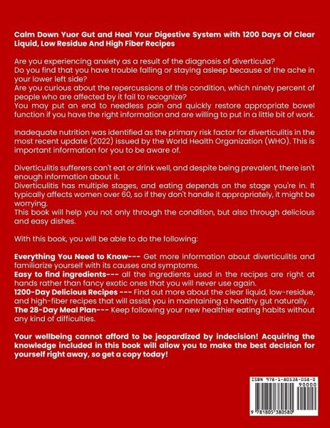 Calm Down Yuor Gut and Heal Your Digestive System with 1200 Days Of Clear Liquid, Low Residue And High Fiber Recipes Are you experiencing anxiety as a result of the diagnosis of diverticula?Do you find that you have trouble falling or staying asleep because of the ache in your lower left side?Are you curious about the repercussions of this condition, which ninety percent of people who are affected by it fail to recognize?You may put an end to needless pain and quickly restore appropriate bowel function if you have the right information and are willing to put in a little bit of work. Inadequate nutrition was identified as the primary risk factor for diverticulitis in the most recent update (2022) issued by the World Health Organization (WHO). This is important information for you to be aware of. Diverticulitis sufferers can't eat or drink well, and despite being prevalent, there isn't enough information about it.Diverticulitis has multiple stages, and eating depends on the stage you're in. It typically affects women over 60, so if they don't handle it appropriately, it might be worrying.This book will help you not only through the condition, but also through delicious and easy dishes. With this book, you will be able to do the following: Everything You Need to Know--- Get more information about diverticulitis and familiarize yourself with its causes and symptoms.Easy to find ingredients--- all the ingredients used in the recipes are right at hands rather than fancy exotic ones that you will never use again.1200-Day Delicious Recipes --- Find out more about the clear liquid, low-residue, and high-fiber recipes that will assist you in maintaining a healthy gut naturally.The 28-Day Meal Plan--- Keep following your new healthier eating habits without any kind of difficulties.Your wellbeing cannot afford to be jeopardized by indecision! Acquiring the knowledge included in this book will allow you to make the best decision for yourself right away, so get a copy today!
