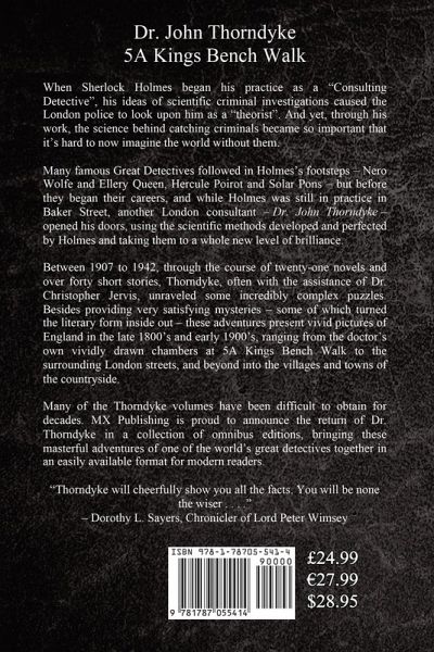 Volume V contains the seventh, eighth, and ninth full-length Thorndyke adventures, published in 1924, 1925, and 1926, respectively. With each subsequent narrative, Thorndyke’s skills and abilities grown and amaze. The Mystery of Angelina Frood – In which a doctor, newly arrived in Rochester, falls in love with Angelina Frood. When she abruptly vanishes, only Thorndyke’s skills can discover the truth in a most surprising manner. The Shadow of the Wolf – Two men depart on a boat, but only one returns. What follows is one of the best examples of Thorndyke’s method as he plays a deadly game with the player on the other side. The D’Arblay Mystery – A young doctor discovers a body in a pond. Was it an accident, or suicide, or murder? One thing is certain – the danger has not ended with just one death.
