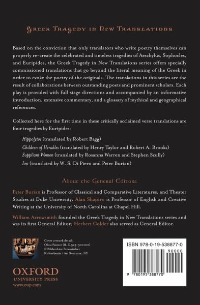 Based on the conviction that only translators who write poetry themselves can properly re-create the celebrated and timeless tragedies of Aeschylus, Sophocles, and Euripides, the Greek Tragedy in New Translations offers new translations that go beyond the literal meaning of the Greek in order to evoke the poetry of the originals. Collected here for the first time in the series are four major works by Euripides all set in Athens: Hippoltos, translated by Robert Bagg, a dramatic interpretation of the tragedy of Phaidra; Suppliant Women, translated by Rosanna Warren and Steven Scully, a powerful examination of the human psyche; Ion, translated by W. S. Di Piero and Peter Burian, a complex enactment of the changing relations between the human and divine orders; and The Children of Herakles, translated by Henry Taylor and Robert A. Brooks, a descriptive tale of the descendants of Herakles and their journey home. These four tragedies were originally avialble as single volumes. This volume retains the informative introductions and explanatory notes of the original editions and adds a single combines glossary and Greek line numbers.
