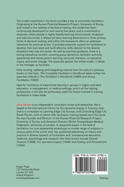 John Heron, well known for his previous books, The Facilitator's Handbook (1989) and Group Facilitation (1993), both of which have become standard reading on the subject, now integrates, builds on and updates those works to provide this comprehensive guide to making a success of facilitation. The key to the new book lies in the way in which it helps facilitators to understand and develop a personal style to their work. Analytical in approach and highly structured, it offers strong theoretical content on the fundamental thinking underlying facilitation (which includes exploration of its dimensions and modes, whole person learning, and a comprehensive group dynamic theory) but combines this with a wide repertoire for practical action designed to enable facilitators to build up their skills effectively. John Heron's distinctive merit here is his demonstration of the benefit to be derived when such skills not only suit facilitator's own personality but can also be matched to whatever situation facilitators encounter. This publication makes John Heron's seminal work newly accessible - for it is now available for the first time in paperback - to a new generation of facilitators in both training and education.