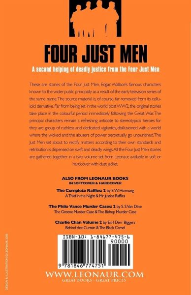 A second helping of deadly justice from the Four Just Men This is the second volume of stories of vigilante justice meted out at the hands of the Four Just Men. These are iconic stories of adventure, intrigue and retribution set in the time immediately following the First World War. Edgar Wallace's prolific pen was never more successful than with the creation of these timeless stories which remain relevant in every way. Wrong doers beware-this is not just a court of no appeal-this is no court! The complete Four Just Men collection has been gathered together by Leonaur in a two volume set with complementing covers and available in soft and hard cover with dust jacket.