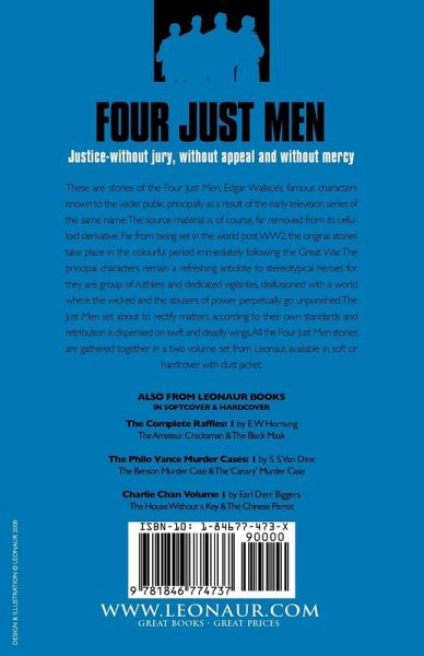 Justice-without jury, without appeal and without mercy These are stories of the Four Just Men, Edgar Wallace's famous characters known to the wider public principally as a result of the early television series of the same name. The source material is, of course, far removed from its celluloid derivative. Far from being set in the world post WW2, the original stories take place in the colourful period immediately following the Great War. The principal characters remain a refreshing antidote to stereotypical heroes for they are group of ruthless and dedicated vigilantes, disillusioned with a world where the wicked and the abusers of power perpetually go unpunished. The Just Men set about to rectify matters according to their own standards and retribution is dispensed on swift and deadly wings. All the Four Just Men stories are gathered together in a two volume set from Leonaur, available in soft or hardcover with dust jacket.