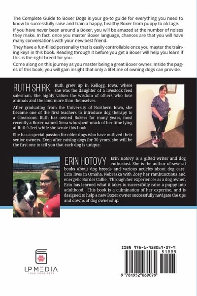 A revolutionary new look into everything "Boxer"; a MUST-READ that includes practical tips, tricks, and insights to help a new (or seasoned) Boxer owner. Using interviews with 5 top Boxer breeders, authors Ruth Shirk and Erin Hotovy have created an in-depth look at what it REALLY takes to successfully live with, raise, and train a Boxer. Covering all the Boxer-specific topics you NEED TO KNOW, such as:The unique characteristics and quirks of the Boxer breed Early training (including housebreaking) strategies for Boxers Choosing the proper supplies and food for a Boxer puppy Helpful strategies for socializing a Boxer with other dogs Health care advice for each stage of your Boxers life Grooming tips that a Boxer owner needs to know! Come along on this journey as you master being a great Boxer owner. Inside the pages of this book, you will gain insight that only a lifetime of owning dogs can provide. If you have never been around a Boxer, you will be amazed at the number of noises that they make. In fact, once you master Boxer language, chances are that you will have many conversations with your new best friend. They have a fun-filled personality that is easily controllable once you master the training keys in this book. Reading through it before you get a Boxer will help you learn if this is the right breed for you. Boxers tend to be a little leery around strangers, so it is important to train them properly as puppies. They are extremely brilliant, so you need to know how to be the pack leader from day one. Chapter topics include:Boxer History Choosing a Boxer Preparing your Home for your Boxer Bringing Home your Boxer Being a Boxer Parent Teaching the Boxer to Behave Socializing with People and Animals Boxers and Your Other Pets Physical and Mental Exercise Training your Boxer Basic Commands Traveling with Your Boxer Nutrition Grooming your Boxer Basic Health Care Advanced Boxer Health and Aging Dog Care If you are considering bringing a Boxer into your home (or already have!) then you need to read this book as soon as possible!