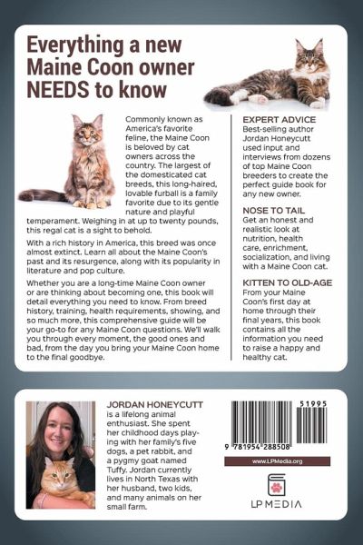Author Jordan Honeycutt used interviews with 14 TOP Maine Coon Breeders to create the perfect guidebook for any new Maine Coon owner! This book is a comprehensive guide to everything Maine Coon! Covering everything a new owner will need to know including:Selecting the perfect Maine Coon cat from a reputable breeder Health tests and certifications Preparing your home and family for your new Maine Coon cat The emotional needs of a Maine Coon Detering common bad behaviors Training and socialization (including clicker training basics) Grooming tips for a Maine Coon Nutritional advice Common Maine Coon diseases, illness, and prevention Cat shows and competitions: an introduction Adjustments for an aging Maine Coon cat Commonly known as America's favorite feline, the Maine Coon is beloved by cat owners across the country. The largest of the domesticated cat breeds, this long-haired, lovable furball is a family favorite due to its gentle nature and playful temperament. Weighing in at up to twenty pounds, this regal cat is a sight to behold. With a rich history in America, this breed was once almost extinct. Learn all about the Maine Coon's past and its resurgence, along with its popularity in literature and pop culture. Whether you are a long-time Maine Coon owner or are thinking about becoming one, this book will detail everything you need to know. From breed history, training, health requirements, showing, and so much more, this comprehensive guide will be your go-to for any Maine Coon questions. We'll walk you through every moment, the good ones and bad, from the day you bring your Maine Coon home to the final goodbye.