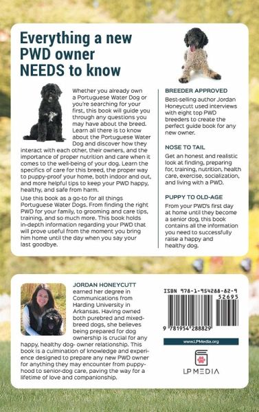 The Hardcover edition is printed in FULL COLOR! A revolutionary new look into everything "Portie"; a MUST-READ that includes practical tips, tricks, and insights to help a new (or veteran) Portuguese Water Dog owner. Author Jordan Honeycutt used interviews with EIGHT top PWD breeders to create an in-depth look at what it REALLY takes to successfully live with, raise, and care for a Portuguese Water Dog. "The PWD is an active, energetic, intelligent breed. They require daily exercise, such as long walks, playing Frisbee or fetch, hiking, or swimming. Mental stimulation in the form of training is very important in the first year. This breed has a true need to be an active member of the family. The PWD does not thrive in a home that is sedentary. A family that leads an active lifestyle and enjoys having their dog tag along makes the best PWD home." Jill Roudebush-Maritimo Portuguese Water Dogs Covering all the PWD-specific topics you NEED TO KNOW, such as:PWD History: Learn about the origins of the Portuguese Water Dog. Witness the evolution of this extraordinary breed, from its rich past that traces back to the shores of Portugal. Originally bred as versatile working dogs by fishermen, these skilled companions navigated the high seas, diving fearlessly into turbulent waters to retrieve nets and even messages between ships. Choosing a PWD: When selecting the perfect Portuguese Water Dog for your family, consider their energy level and compatibility with your lifestyle. Whether you choose to adopt from a shelter or work with a reputable breeder, ensure that the dog's temperament and needs align with your family's dynamics and activity level for a harmonious and fulfilling companionship. Prepare for Adventure: Welcoming a PWD into your home involves creating a safe environment both indoors and outdoors, as these dogs are known for their love of water and energetic nature. Securely fence your yard and remove any hazardous objects, while also considering water safety measures. Indoors, be sure to puppy-proof your home by keeping valuable items out of reach and providing interactive toys to channel their energy, ensuring a smooth transition for both your family and the adventurous water-loving pup. The Arrival: In the first few weeks with a Portuguese Water Dog puppy, be prepared for their high energy levels, intelligence, and desire for social interaction. Engage them in stimulating activities, provide consistent training, and establish a routine to keep them mentally and physically engaged, fostering a strong bond and a well-behaved companion. Successful Training: When training a PWD puppy, leverage their intelligence, willingness to please, and natural affinity for water-related activities. Utilize positive reinforcement techniques, such as rewards and praise, and keep training sessions fun and engaging. Be consistent and patient, as this breed may exhibit a stubborn streak at times, requiring firm but gentle guidance to achieve desired results. Make Potty Training Simple: To successfully potty train a PWD puppy, emphasize positive reinforcement by rewarding them with treats, praise, and playtime when they eliminate in the appropriate spot. Avoid using negative reinforcement or punishment, as it can create fear and hinder the training process. Consistency, patience, and establishing a regular schedule for potty breaks are key to helping your puppy develop good bathroom habits.